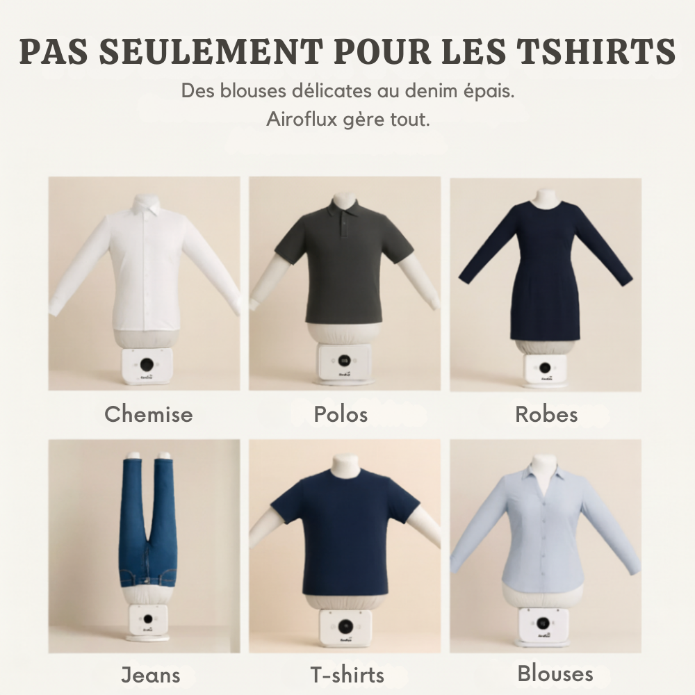 A:Airoflux fonctionne avec les chemises, blouses, pantalons, t-shirts et même les robes. Les tissus délicats, comme la laine, ne sont pas recommandés avec cet appareil.