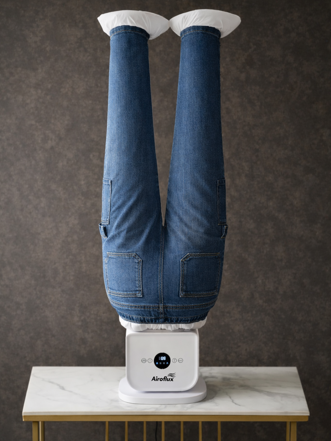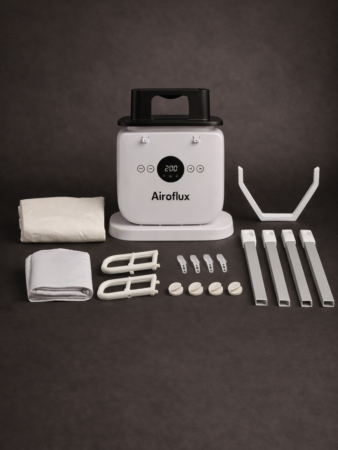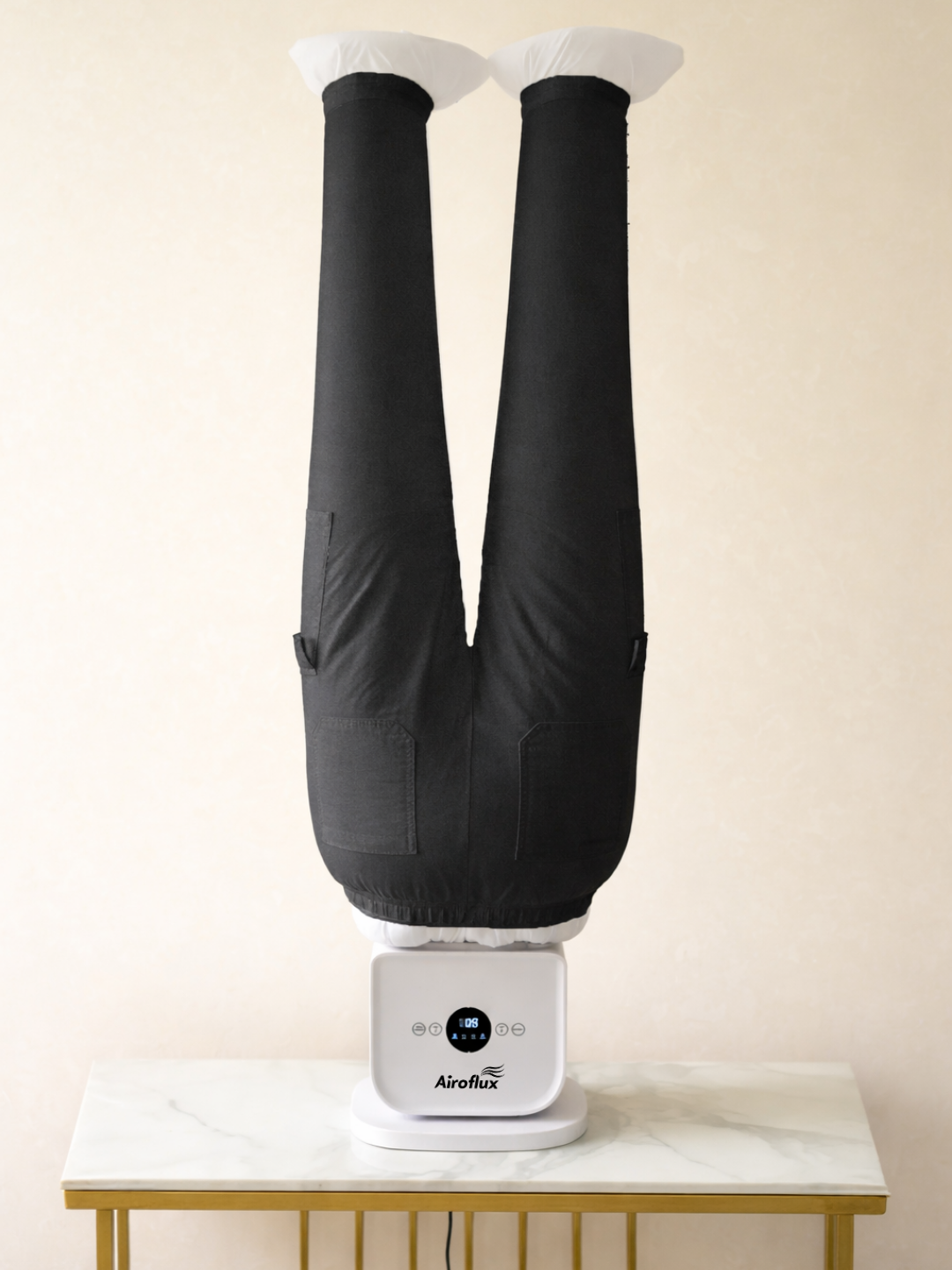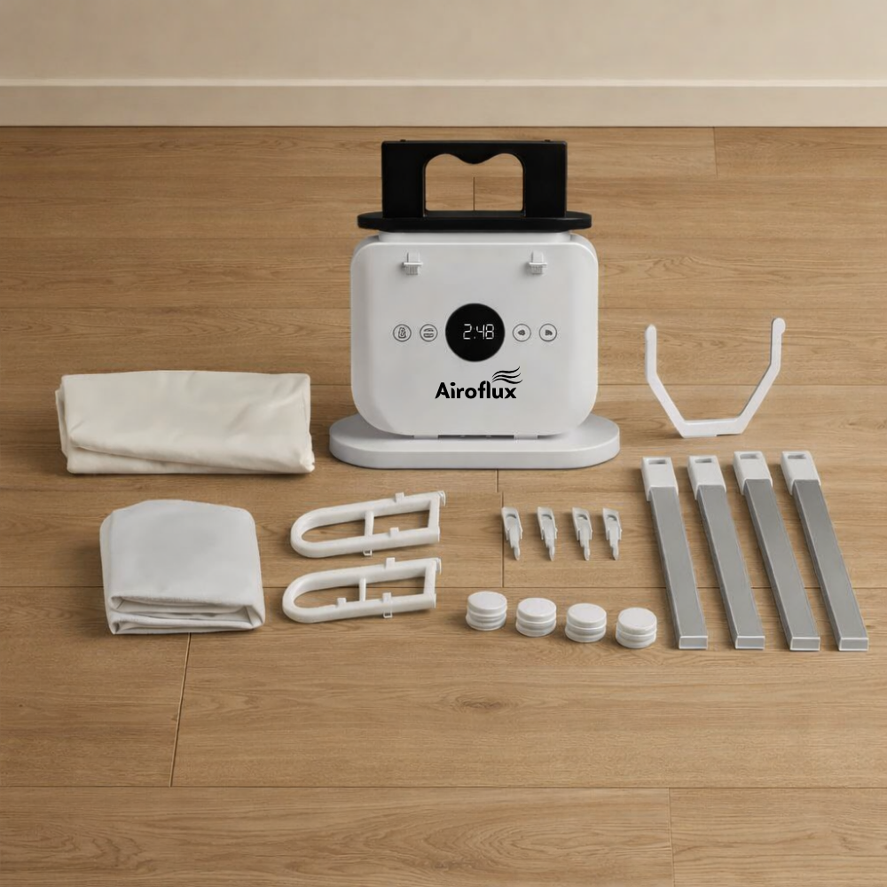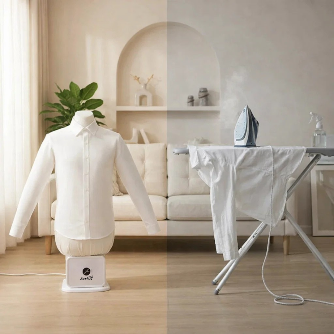 Les hôtels de luxe utilisent depuis des décennies des systèmes industriels à air chaud. Pas de fer à repasser (trop lent, trop risqué). Pas de défroisseur (laisse les vêtements humides). Airoflux utilise une inflation contrôlée pour tendre le tissu, appliquer une chaleur précise et fixer un repassage net pendant le séchage - désormais conçu pour votre maison.